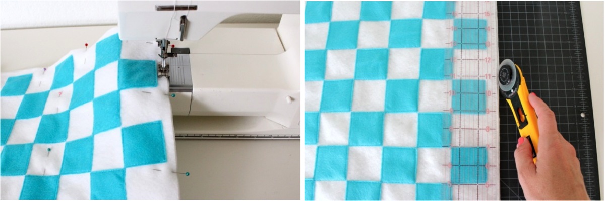 • When the top checkerboard is done, lay it over the other large white square piece. Pin them together and baste sew them about 1/4 inch from the edge all the way around. Use a rotary cutter to trim any uneven edges.
